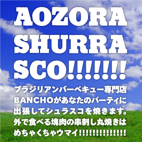 「ブラジリアン食堂BANCHO」がプロデュースする出張バーベキュー(シュラスコ)サービスです。あなたのパーティで、シェフが炭火焼シュラスコを調理します。手ぶらで現地にお越しいただければ、最高においしい肉にありつけます。